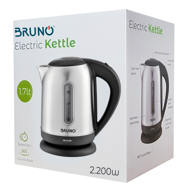 Ηλεκτρικός βραστήρας εξαιρετικής απόδοσης της BRUNO με ισχύ 2200W και χωρητικότητα 1,7 lt. Εξοπλίζεται με περιστρεφόμενη βάση 360° και εργονομική λαβή για εύκολο κράτημα. Επιπλέον διαθέτει σύστημα ασφαλείας κατά του βρασμού χωρίς νερό και σύστημα αυτόματης διακοπής βρασμού.